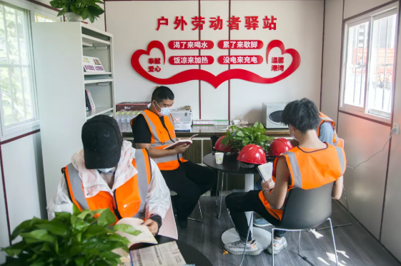 青岛西海岸新区总工会建设可移动户外劳动者驿站,突出便利、可移动的特点,达到“项目建设到哪里,驿站扎根在哪里”的目的,驿站跟着项目走,持续提供贴心暖心服务。移动式户外劳动者驿站服务内容涵盖“便民服务、爱心医务、工友活动、利工利民”等服务功能,占地30平方米,配备冰箱、微波炉、饮水机、空调、书刊架、应急药箱、休息桌椅等基础设施,项目施工单位还根据实际增添了雨具、储物柜、置物架等服务设施,全方位保障建筑工友的需求。